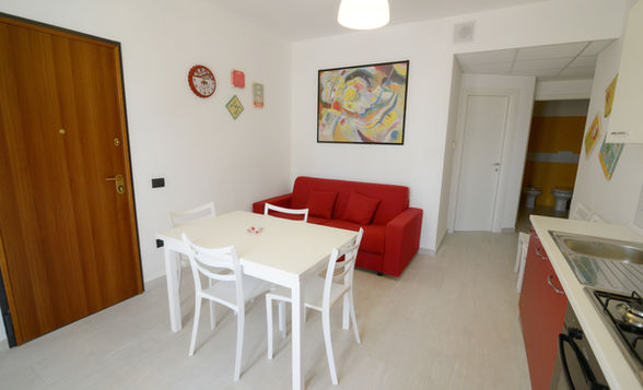 Descrizione: Bilocale ubicato al piano terra, di circa 40 mq, composto da soggiorno con angolo cottura e divano letto matrimoniale, 1 camera da letto matrimoniale più letto singolo, bagno con doccia, veranda esterna di pertinenza esclusiva parzialmente coperta, 1 posto auto all’interno del Residence.